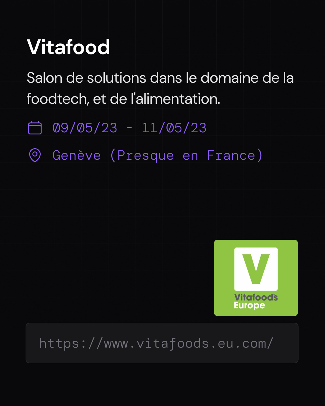 "Attirant chaque année plus de 15 000 experts de l'industrie de plus de 130 pays, Vitafoods Europe est l'endroit idéal pour le réseautage, la collaboration et l'innovation." - Date :