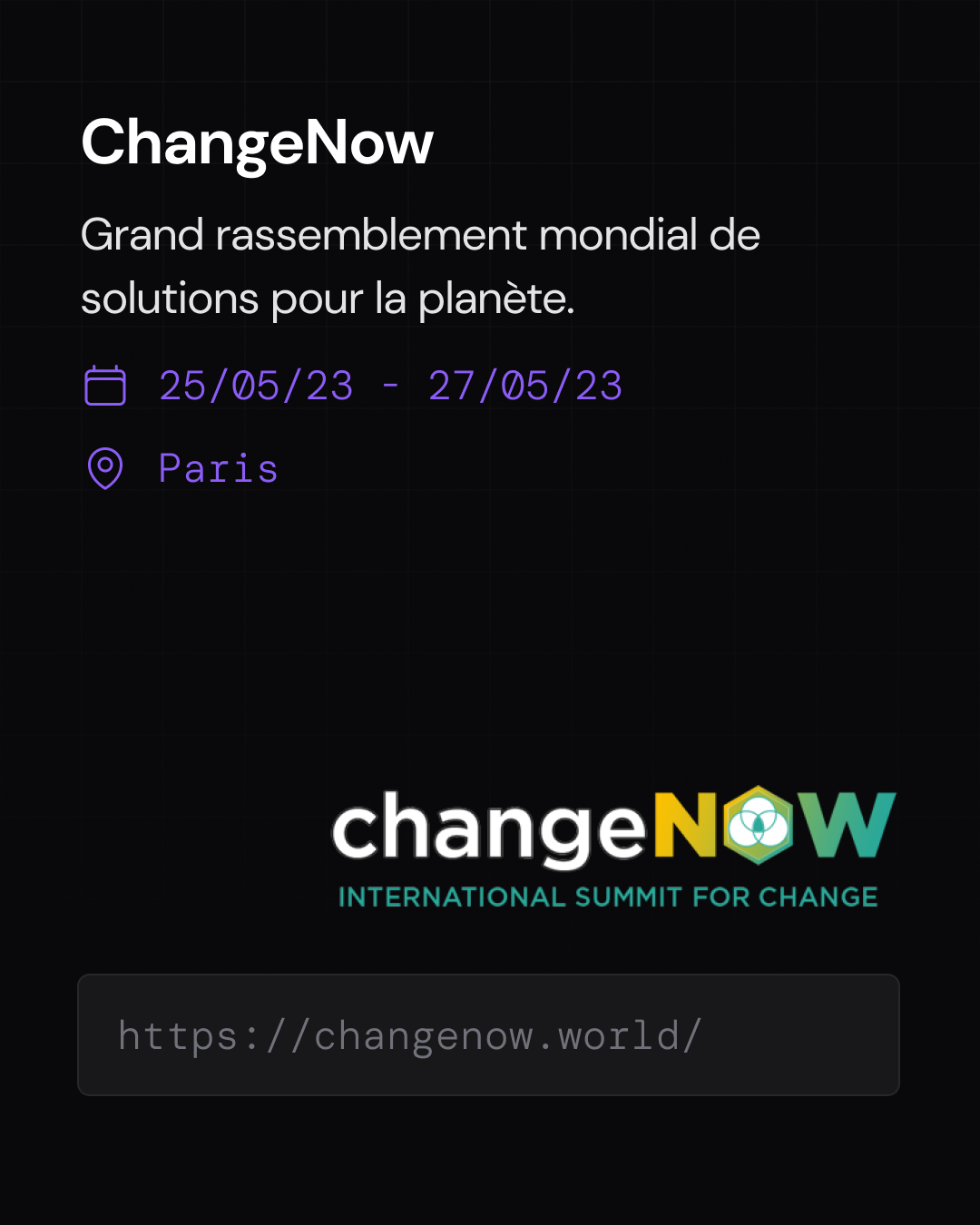 "ChangeNOW 2023 est un sommet de trois jours qui rassemble les solutions les plus innovantes et les acteurs du changement qui s'attaquent aux plus grands défis de notre planète, afin qu'ils agissent ensemble. ChangeNOW construit des ponts entre les entrepreneurs, les chefs d'entreprise et les décideurs politiques pour accélérer le changement." - Date :