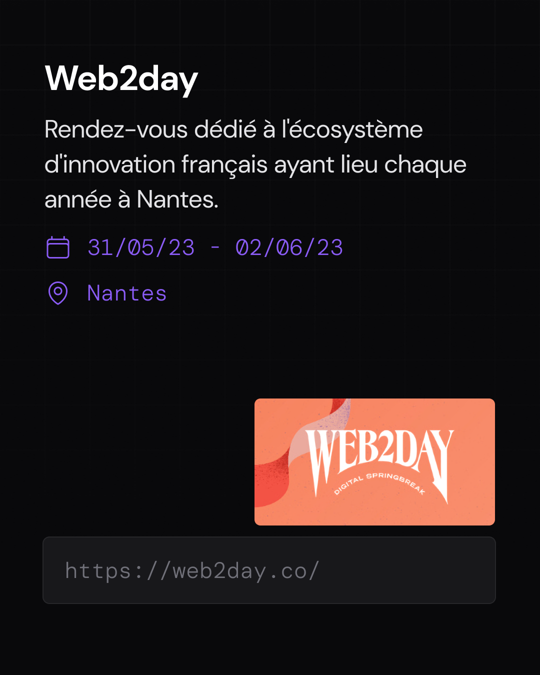 "Le Web2day, le festival de l’innovation sacré « meilleure ambiance de France ». Ici, on apprend, on partage et on prend de la hauteur. Vous faire vivre 3 jours époustouflants, plein de savoirs, de rencontres et de joie." - Date :