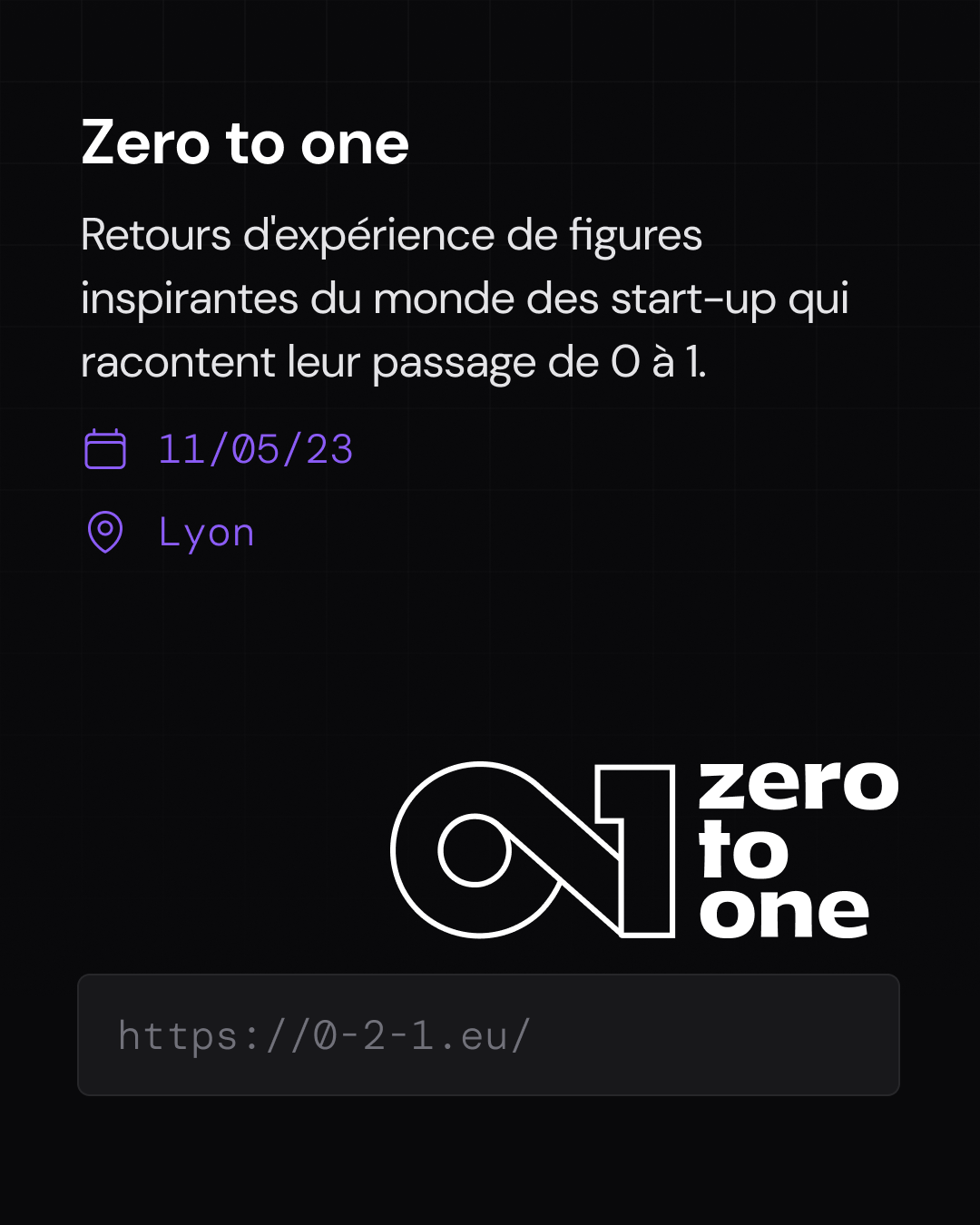 "Passer de 0 à 1, c’est accepter sa vulnérabilité, sortir de sa zone de confort et faire évoluer ses pratiques.Un précepte qui nous permet de continuer de nous former, d'innover et de construire le monde de demain.zero to one vous invite à rencontrer des talents qui partagent cet état d’esprit." - Date :