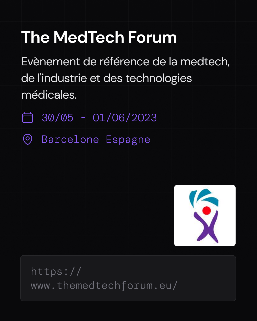 "Le MedTech Forum est la plus grande conférence de l'industrie de la santé et des technologies médicales en Europe et un événement clé depuis 2007. Rejoignez des leaders de l'industrie, des innovateurs et des investisseurs de premier plan pour discuter des opportunités futures dans le secteur des technologies médicales." - Date :