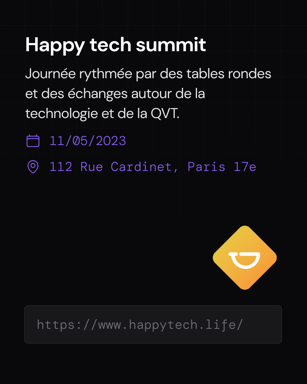 "Le Summit happytech, c’est une journée rythmée par des tables rondes et des échanges autour de la technologie & de la QVT !" - Date :