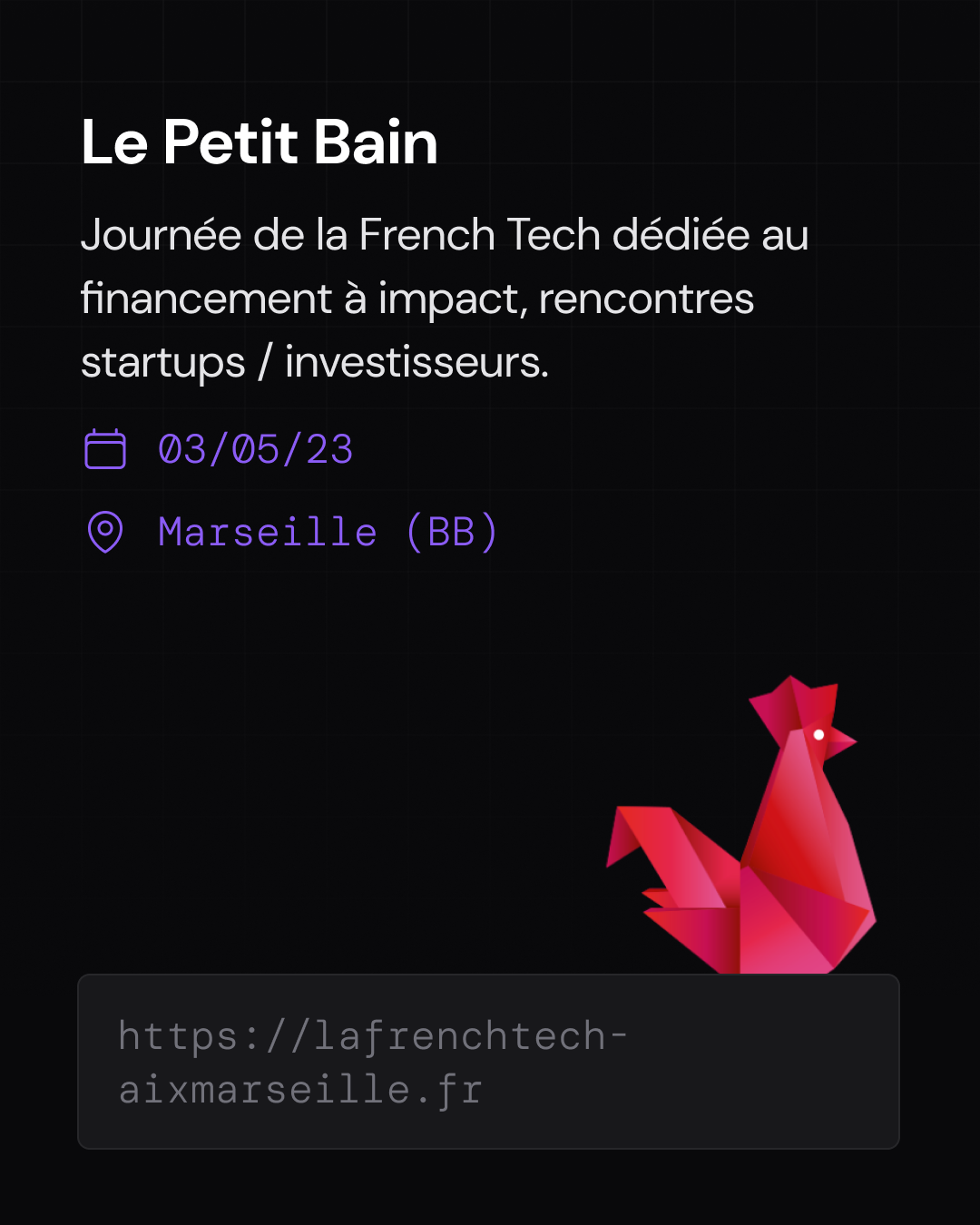 "En attendant le Grand Bain prévu en septembre, nous vous invitons le 3 mai prochain dès 14h à un Petit Bain de La French Tech Aix-Marseille : une journée dédiée au financement à impact !" - Date :