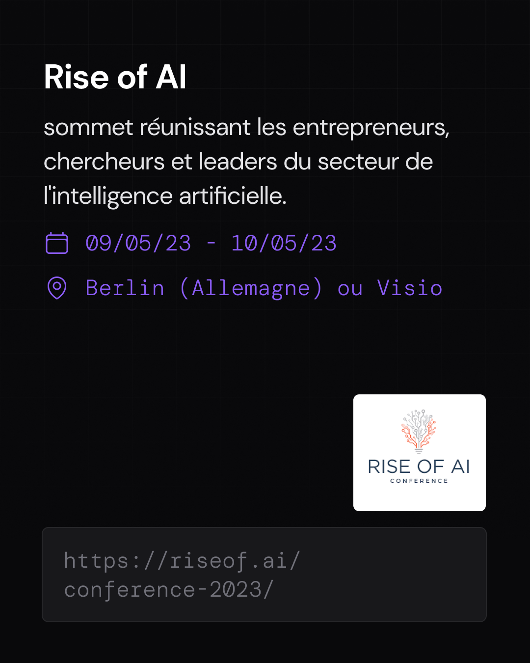"Depuis 2015, la conférence annuelle Rise of AI met en relation des experts de l'IA, des décideurs, des leaders d'opinion et des changeurs de jeu pour discuter de l'intelligence artificielle pour la société, la politique et l'économie." - Date :
