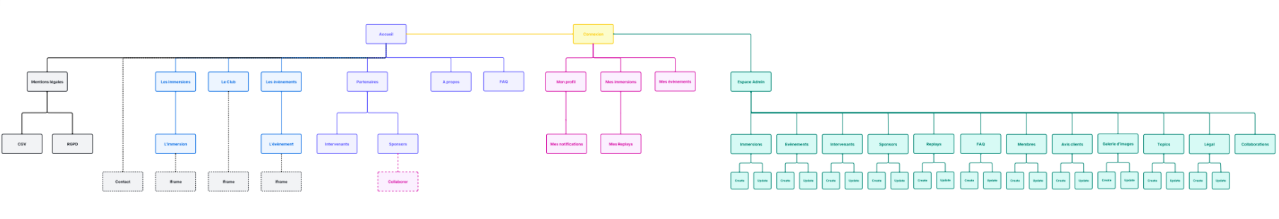 Un sitemap complet avec toutes les pages devrait ressembler à ça. En vert : les pages administrateur, en rose les pages membres, en bleu et violet : les pages vitrine, en gris les interactions... (tu fais comme tu veux pour les couleurs ☺️) 👇
