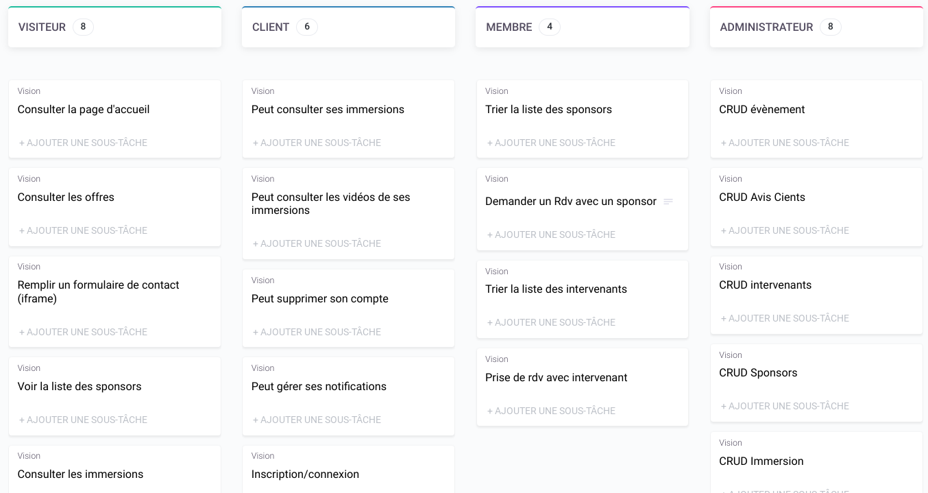 Les users stories : les interactions pour chaque utilisateurs